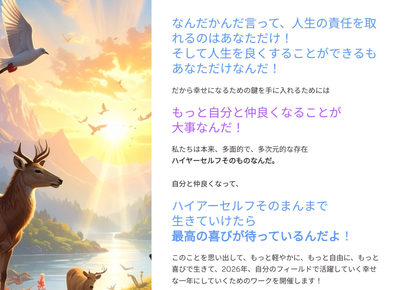 どちらも「ハイヤーセルフの自分として生きる」と言うことをテーマにしています。もうこの人間的な側面だけの自分だけで、何とかしようとコントロールしたり、孤独だと感じたり、苦しんだりするのは終わりにしませんか?