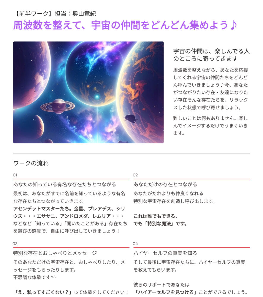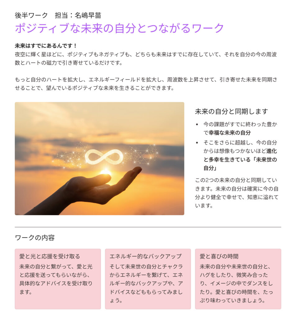 「自分が宇宙の仲間とどんどん仲良くなっていこう」と言う前半のワークと、「自分の調和の取れている未来や未来世から癒しやガイダンスをもらおう」と言う後半のワーク。